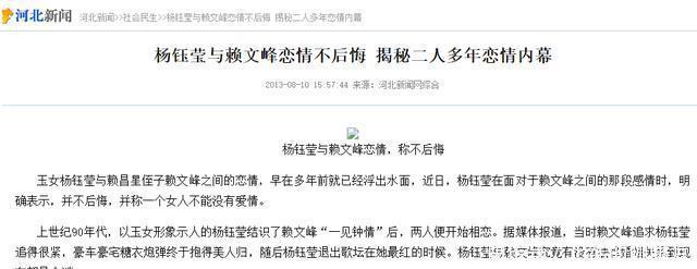 杨钰莹为赖文峰退圈 要讲楚玲这件事情,得先提提二十多年前杨钰莹和赖文峰的那段感情。 当年杨钰莹凭着《轻轻的告诉你》火遍全国,1994年认识赖文峰后,两人很快走到了一起。 后来有报道说,赖文峰追求杨钰莹的时候挺用心,两人甚至商量过以后要三个孩子。